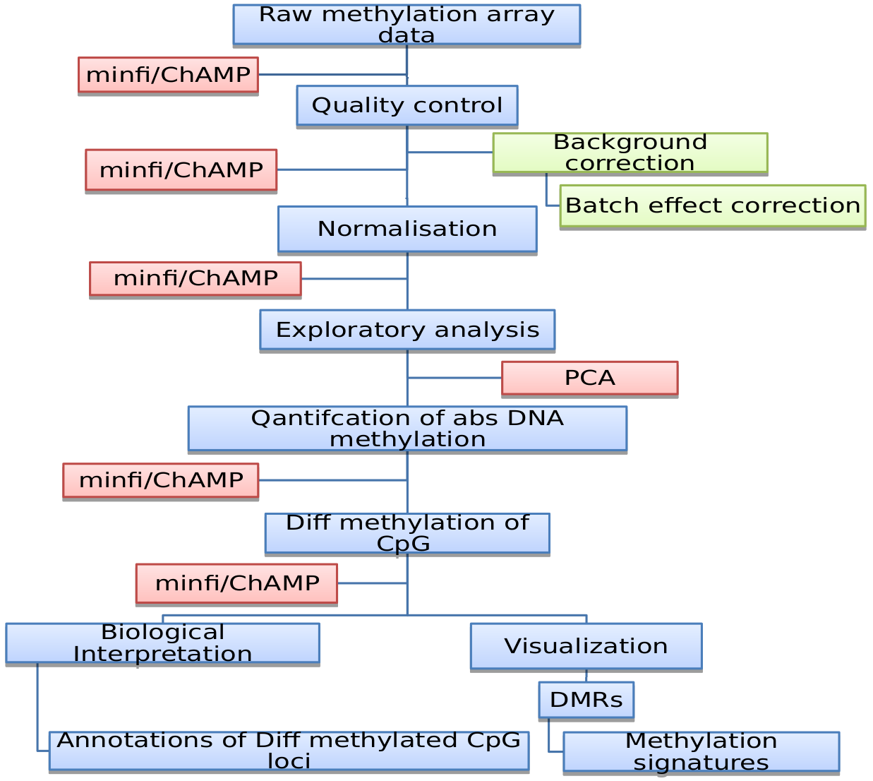 ChAMP/minfi will be used to study and correct background noise & batch effect in raw data prior to downstream analysis.